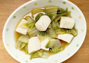 高野豆腐 6個・水 400ML・はくさい 100g・しいたけ 2枚・でんぷんはるさめ 5g・鶏ガラスープの素 小さじ1/2・しょうゆ 小さじ1